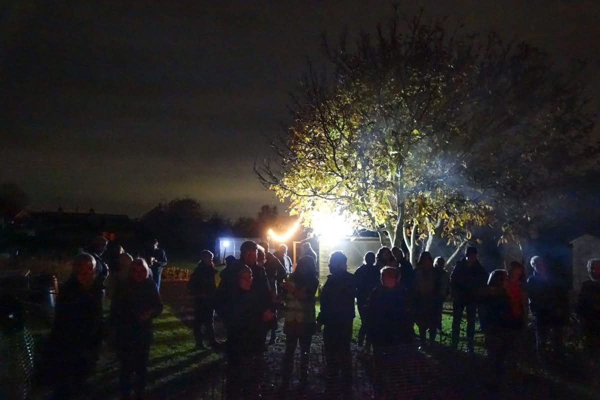 In the glow of a blazing bonfire, plotholders enjoyed a evening social with drinks, hot dogs and a few fireworks.